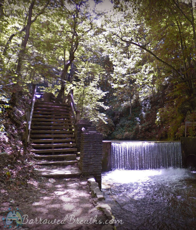 It may be a little bumpy, and if it’s been raining you may need to worry about sinking into the soft dirt. But on a nice sunny day, if you’re managing to get around the village okay. It shouldn’t be that much more effort to get to the water fall. Be it while pulling a cart, walking with a rollator, or riding in a wheelchair. You will notice a decent sized set of stairs. But they are not anything you have to endure to see the falling water.