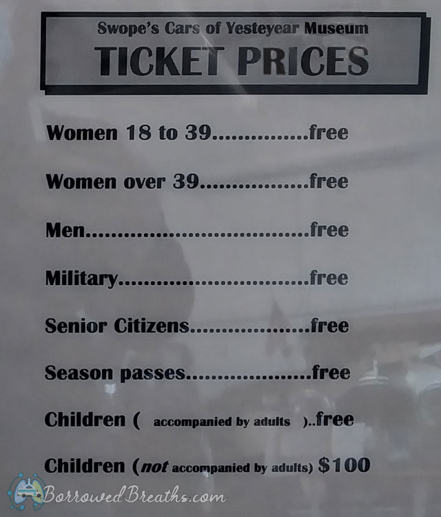 At my absolute worst before being hospitalized, could I have walked around and enjoyed this museum? No… of course not. But I wasn’t out traveling period at all at that point. Going down town to pulmonary rehab was a major outing. And I don’t know your physical well being. So I can’t say definitively to, “Go for it.” But if you live near Elizabethtown and are capable of getting out and about. Or if you are passing by and need someplace to get out of the car for the stretching of legs. Then I think Swope’s Vintage Car Museum is a good option. It’s not huge, theres parking is right next to the door, it’s all on one floor with no stairs to climb, and it’s quite a bit more interesting than your average interstate service/comfort center. I would go again should I find myself once more in E-town.