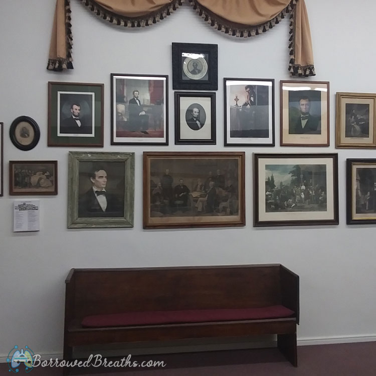 The museum itself isn’t huge. You could probably walk through the whole thing in a couple minutes. (Double that estimation for those folks with higher oxygen needs.) If just doing a lap without looking at anything is your intention. But its not as if there isn’t anything to to look at. With pictures lining the walls, display cases running along all of the walls, and several wax mannequin recreation scenes. Most of what you will find here is things from the time of Abraham Lincoln and information about his life. It’s not really so much a destination of actual physical Lincoln artifacts. But its still neat.
