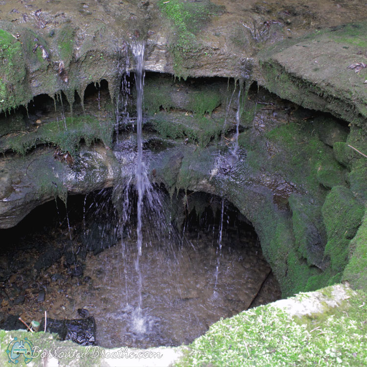 Getting down to the base of the monument requires taking a short set of stairs, a long winding path, or walking through the grass. With the most direct way up to the monument being a large flight of stairs. Off to the sides a little ways are a series of shorter sets of steps. Broken up by flat areas… but its kind of a trade off. A longer walk for fewer steps. And a third way to the top, involving a relatively short hike. (As far as hiking goes.) Though a small wooded area along the properties border. Uphill of course, but spread out over a more gentle slope. The only way to the homestead’s old spring however. Is down a set of stone stairs and back up. Sadly there’s no other way to see it.